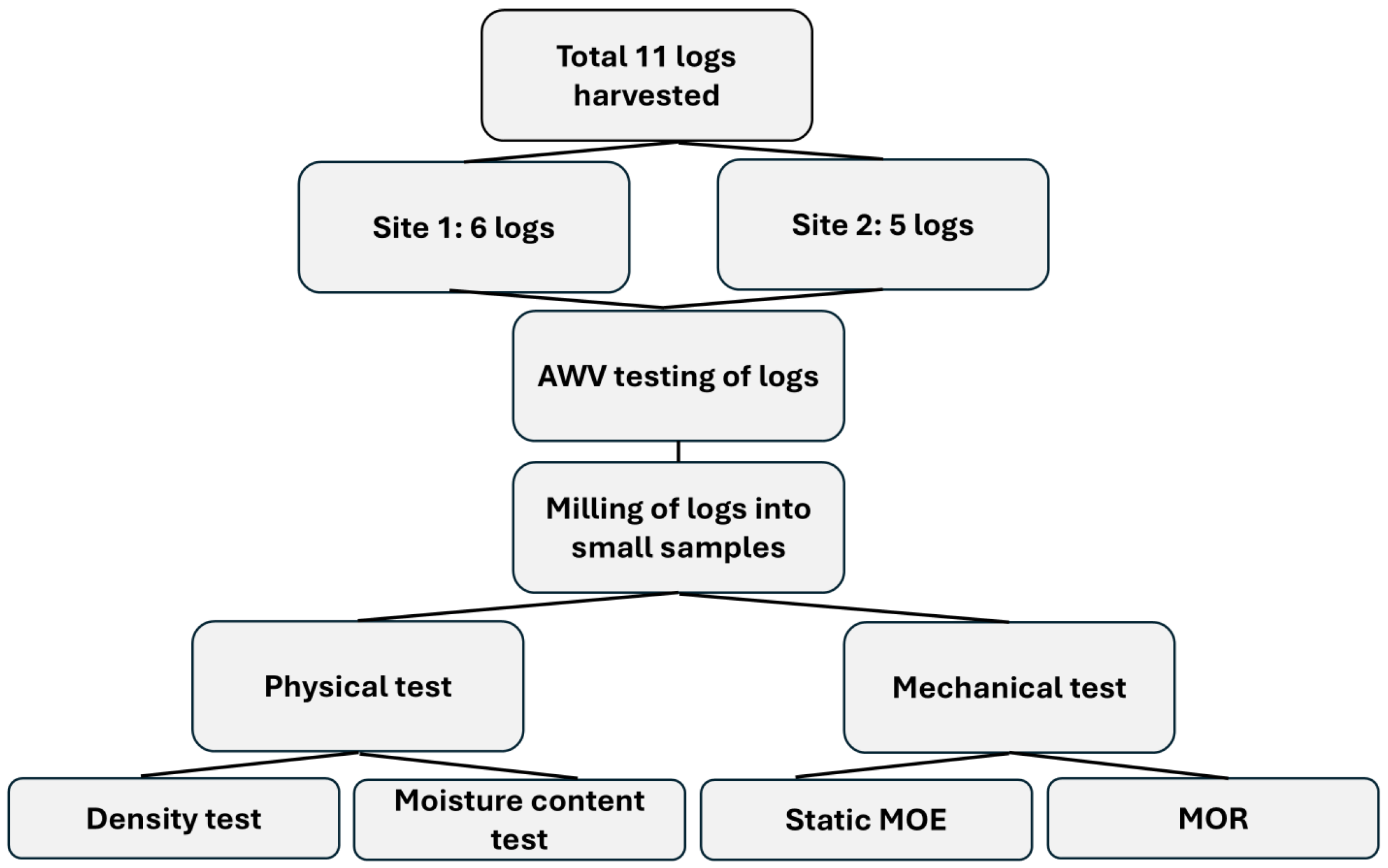 E. nitens logs, primarily fibre-managed for pulp wood and collected from two different harvesting sites. Six 18-year-old butt logs were sourced from Site 1: Neville Smith Forest Products log yard in Southern Tasmania (