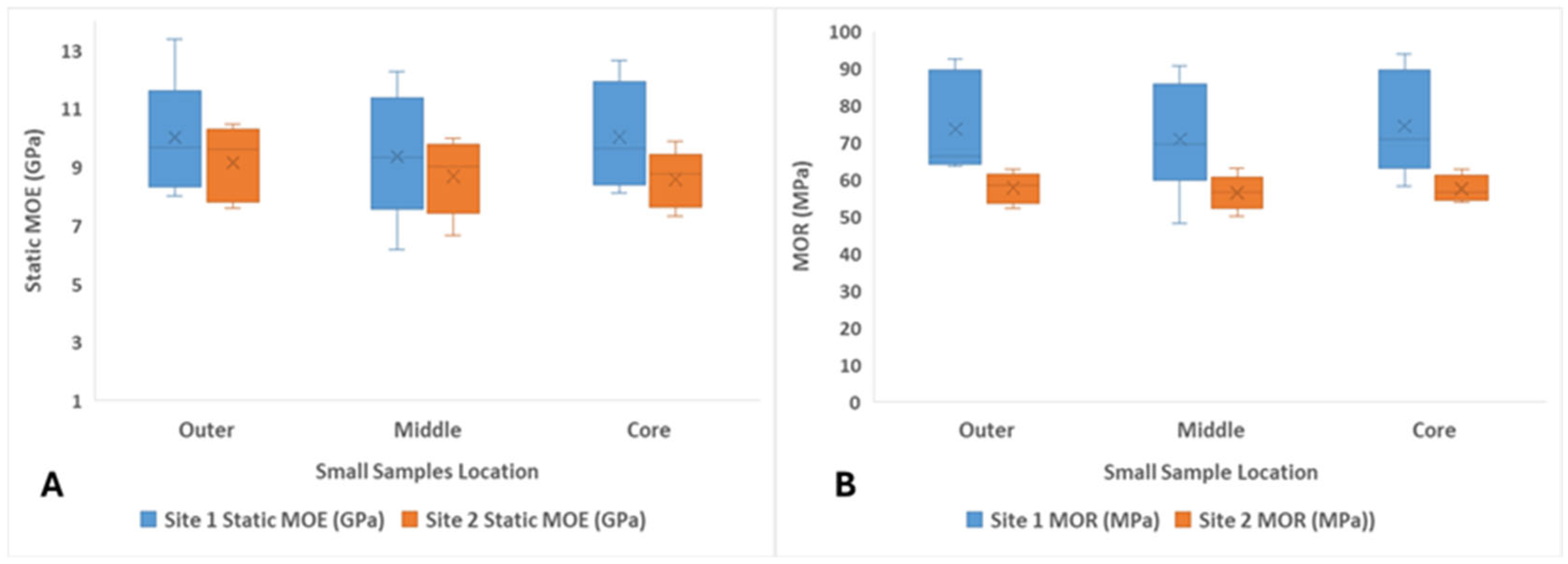 Similarly, the second boxplot illustrates that MOR values for Site 1 are significantly higher than those from Site 2, regardless of location, and showed median MOR values close to or exceeding 80 MPa, whereas Site 2 values remain clustered around 60 MPa or below. The trend of decreasing strength from outer to core location is more evident in Site 1, reflecting typical radial variations in wood properties in dry condition of samples. Site 2 samples not only show lower median values but also exhibit less variability, potentially reflecting more uniform but lower-quality wood characteristics since MC over the fibre saturation point makes little difference to MOE/MOR.
