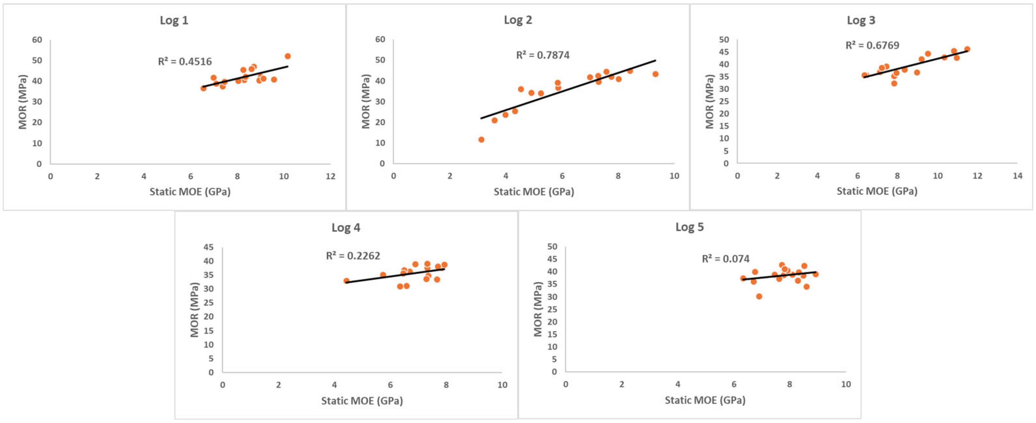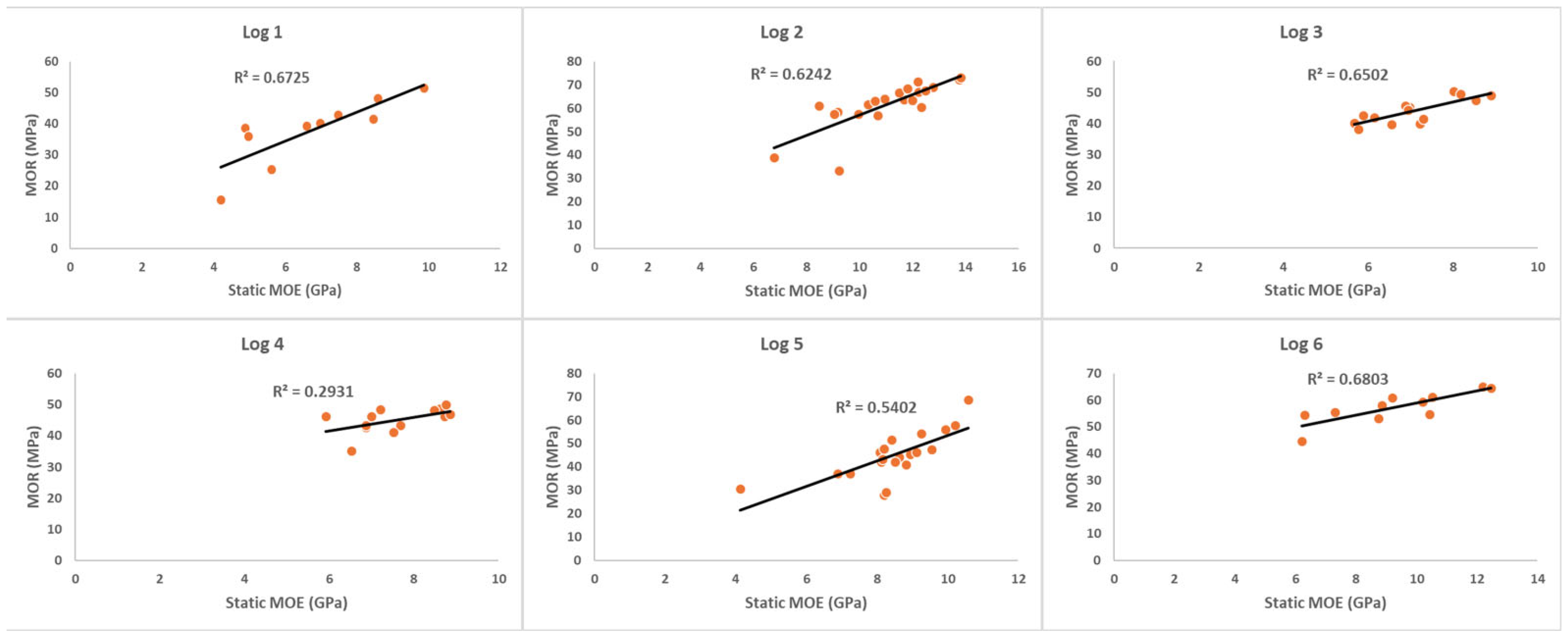 Log 6 demonstrates a strong linear correlation (R2 = 0.68), indicating that as static MOE increases, MOR also increases proportionally. The Site 1 logs showed a correlation range from 0.29 to 0.68, which supports the reliability of static MOE as a predictor of MOR in these cases. Further validation across more logs and sites could strengthen the predictive robustness of this relationship.