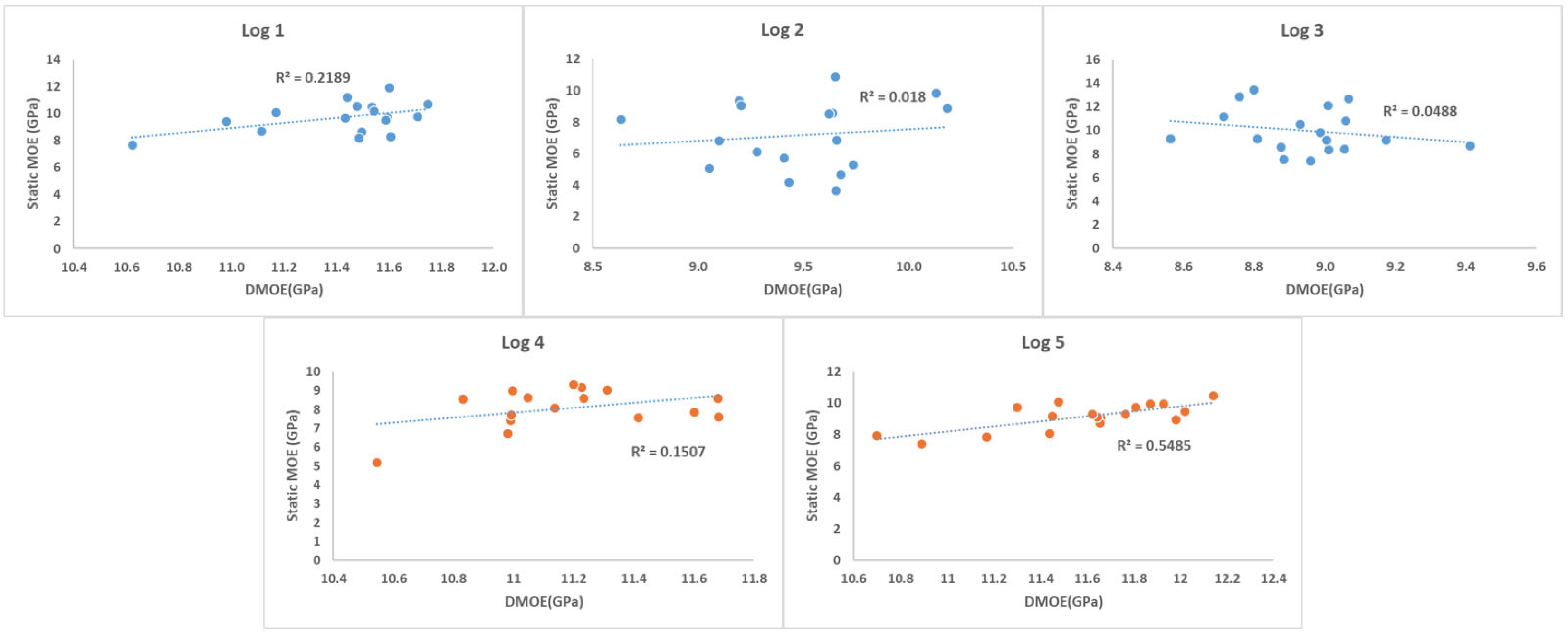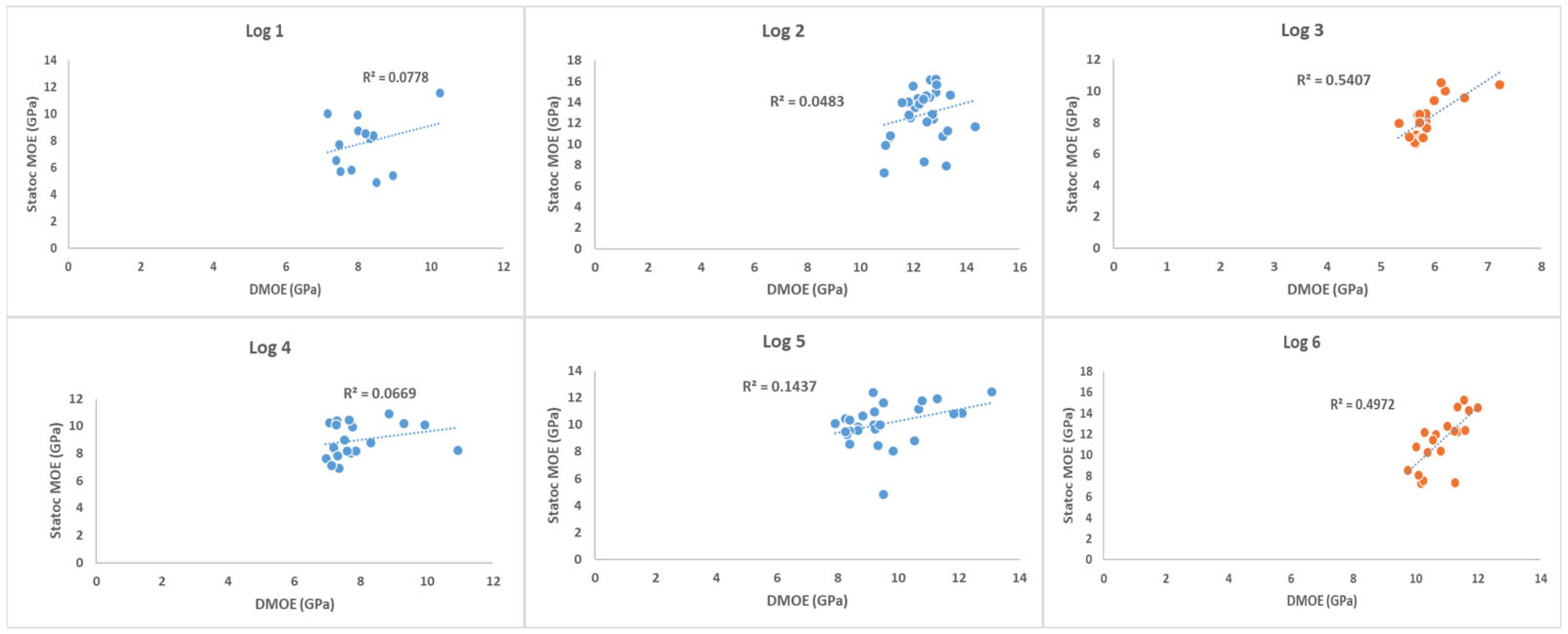 Logs 3 and 6 exhibit the strongest correlations, with an R2 of 0.5407 and 0.4972, suggesting a moderate positive relationship between DMOE and static MOE. This indicates that log 3 and 6 DMOE could somewhat reliably predict static MOE. In contrast, other logs showed a much weaker correlation (R2 ranging from 0.048 to 0.1437), implying that for these logs, DMOE has limited predictive capability for estimating static MOE based on the DMOE of the log.