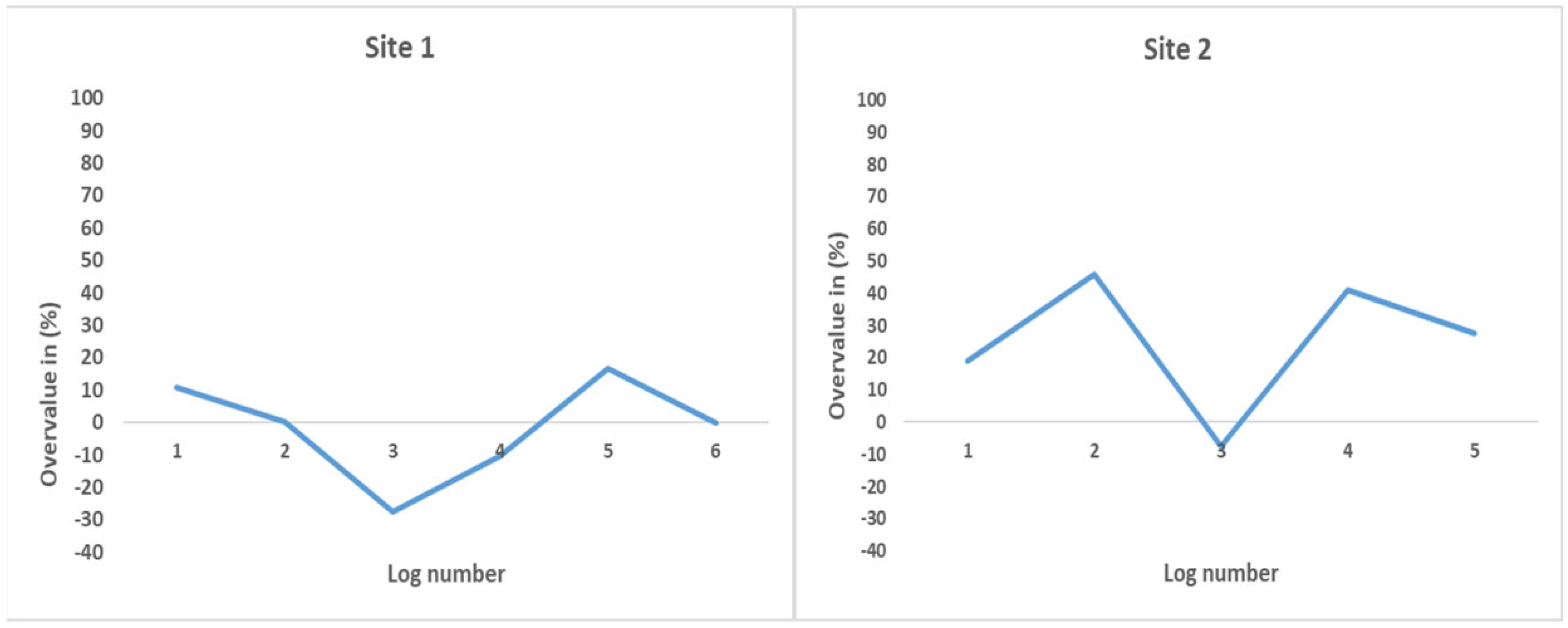 At Site 1, the overestimation of DMOE relative to static MOE exhibited substantial variability across six logs, with overvalue/undervalue percentages ranging from −27.65% to 16.46%. The observed negative deviation in logs 3 and 4 indicates a rare case of underestimation by the NDE method, which deviates from the general trend. Logs 3 and 5 recorded the highest overvaluation/undervaluation, at around −27.65% and 16.46%, respectively, followed by a gradual increase in overvaluation after log 4. This progression suggests that while DMOE generally over- or underpredicts stiffness, the magnitude of this discrepancy is not uniform and is influenced by log-specific properties such as the density distribution, MC, and age of the logs. In a previous study, 18.3% overestimation and 25% underestimation of the static MOE results over DMOE (AWV-based) results for