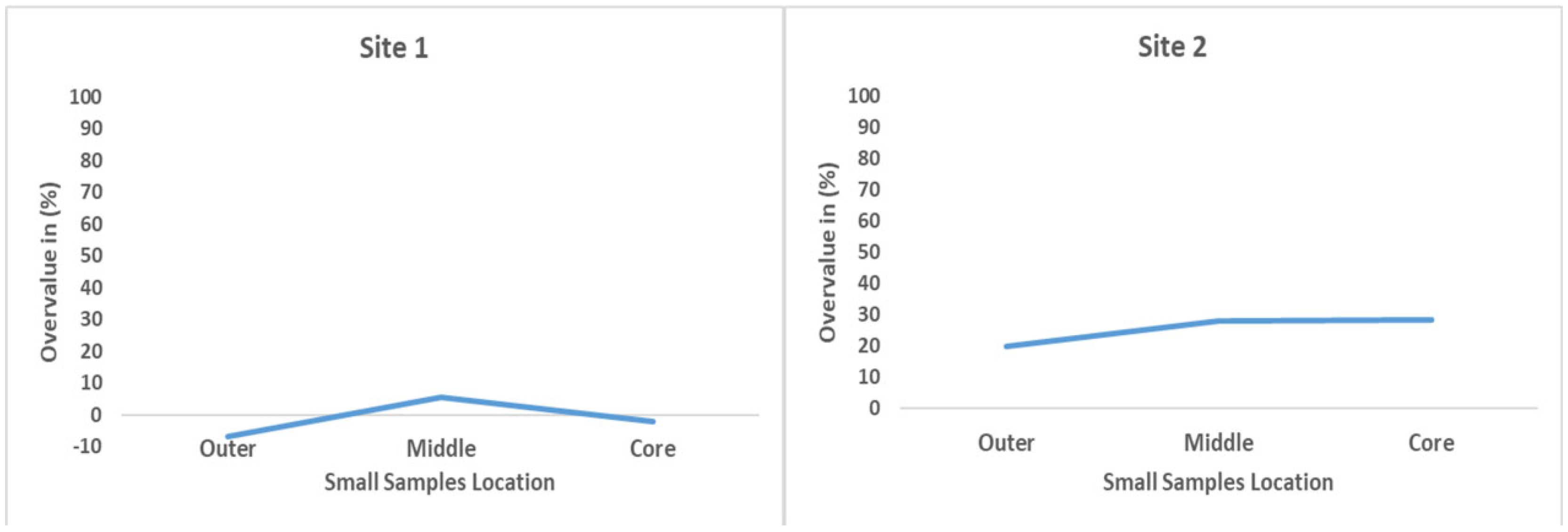 The evaluation of DMOE overestimation relative to static MOE for small clear samples from Site 1 reveals a minimal but consistent influence of location within the log cross-section. The overvalue percentages for the outer, middle, and core locations remain within a narrow range of approximately −7% to 5.34%, indicating relatively stable performance of the DMOE estimation method across radial positions as compared to average log-based data. Specifically, the outer samples show an overvaluation close to −7%, with a slight incremental increase observed toward the middle location, which reaches around 5.34%. In contrast, in Site 2, similar kinds of trends were observed: the overvalue ranges from approximately 19.81% in the outer location to around 28.35 in the core, followed by a slight incline near 27.82% in the middle location.