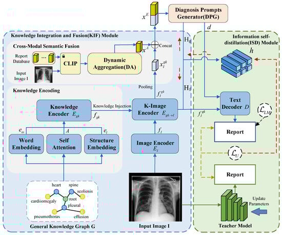 While existing approaches have made significant progress in medical report generation, several critical limitations remain unresolved. First, most current methods treat knowledge integration as a static process and disease classification as a parallel task with implicit expectations, failing to leverage diagnostic information for explicit report guidance. Second, the alignment between visual features and diagnostic text often lacks clinical reasoning depth, as exemplified by approaches like RGRG [43] that rely solely on regional visual features while neglecting diagnostic context. Third, existing frameworks typically maintain a separation between knowledge representation and generation optimization. Our work addresses these gaps through three key innovations: (1) a knowledge graph framework that explicitly models disease progression patterns while maintaining tight feature–text coupling, (2) an adaptive knowledge distillation mechanism that dynamically adjusts to clinical contexts, and (3) a novel architecture with diagnosis prompts generator that fundamentally differs from previous work by synergistically combining visual features with diagnostic cues. Unlike methods that treat classification as an auxiliary task, we explicitly incorporate diagnostic results as generative prompts. This approach establishes a more comprehensive knowledge representation paradigm that actively bridges medical knowledge with patient-specific findings through explicit clinical reasoning pathways.