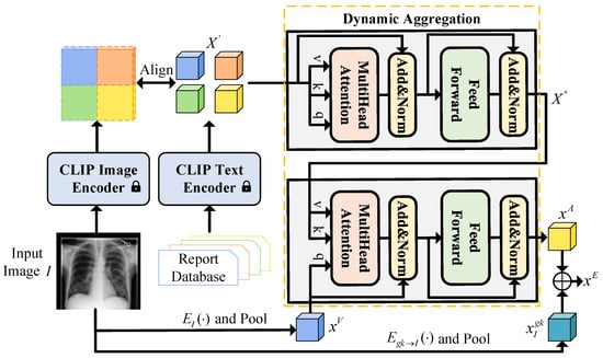 Architecture of the cross-modal semantic fusion module. First, align image features with text features using CLIP to identify the most relevant report text feature . This feature is then input alongside the pooled feature from the encoder into the dynamic aggregation module and finally combines the pooled feature with the fused feature to obtain the enhanced feature .