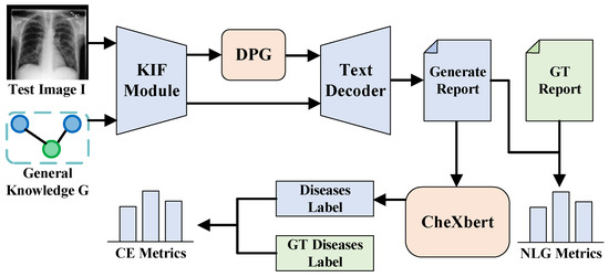 Model evaluation flowchart: KIF denotes the Knowledge Integration and Fusion Module; DPG denotes the diagnosis prompts generator, which generates disease prompts. These prompts are input into the text decoder alongside features fused through KIF to generate reports. The resulting reports are then processed by CheXbert [46] to obtain the disease classification for diagnosis. Finally, metrics are calculated by comparing these outputs with ground truth (GT).