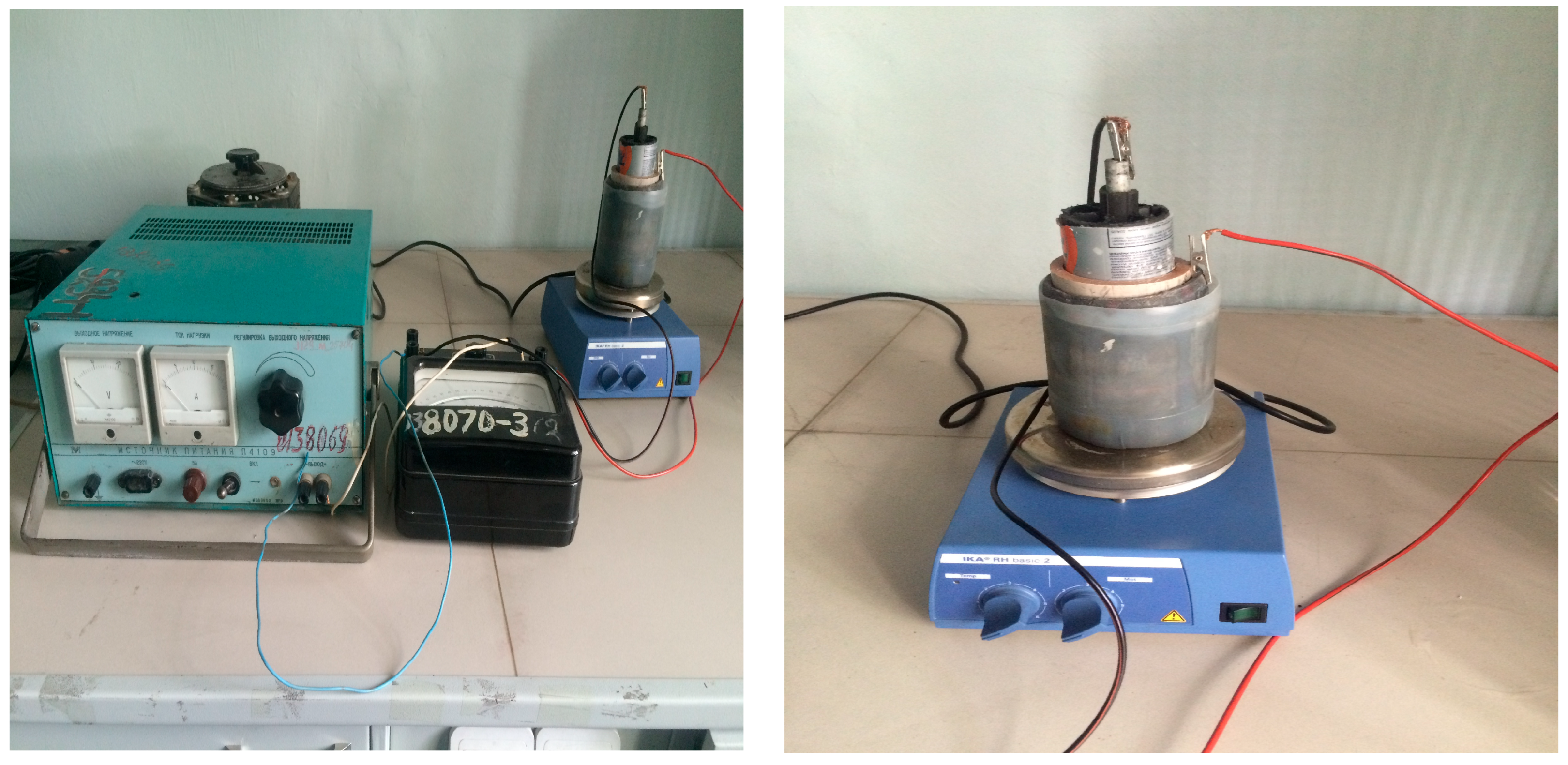 Before starting the process, a mixture of ore and electrolyte was introduced into the anode compartment of the electrolyzer and stirred using a mixer at 120–150 rpm, while only acid was poured into the cathode compartment. During electrolysis, vanadium oxidation reactions occur in the anode chamber, while water decomposition with hydrogen evolution takes place at the cathode according to the following reaction: