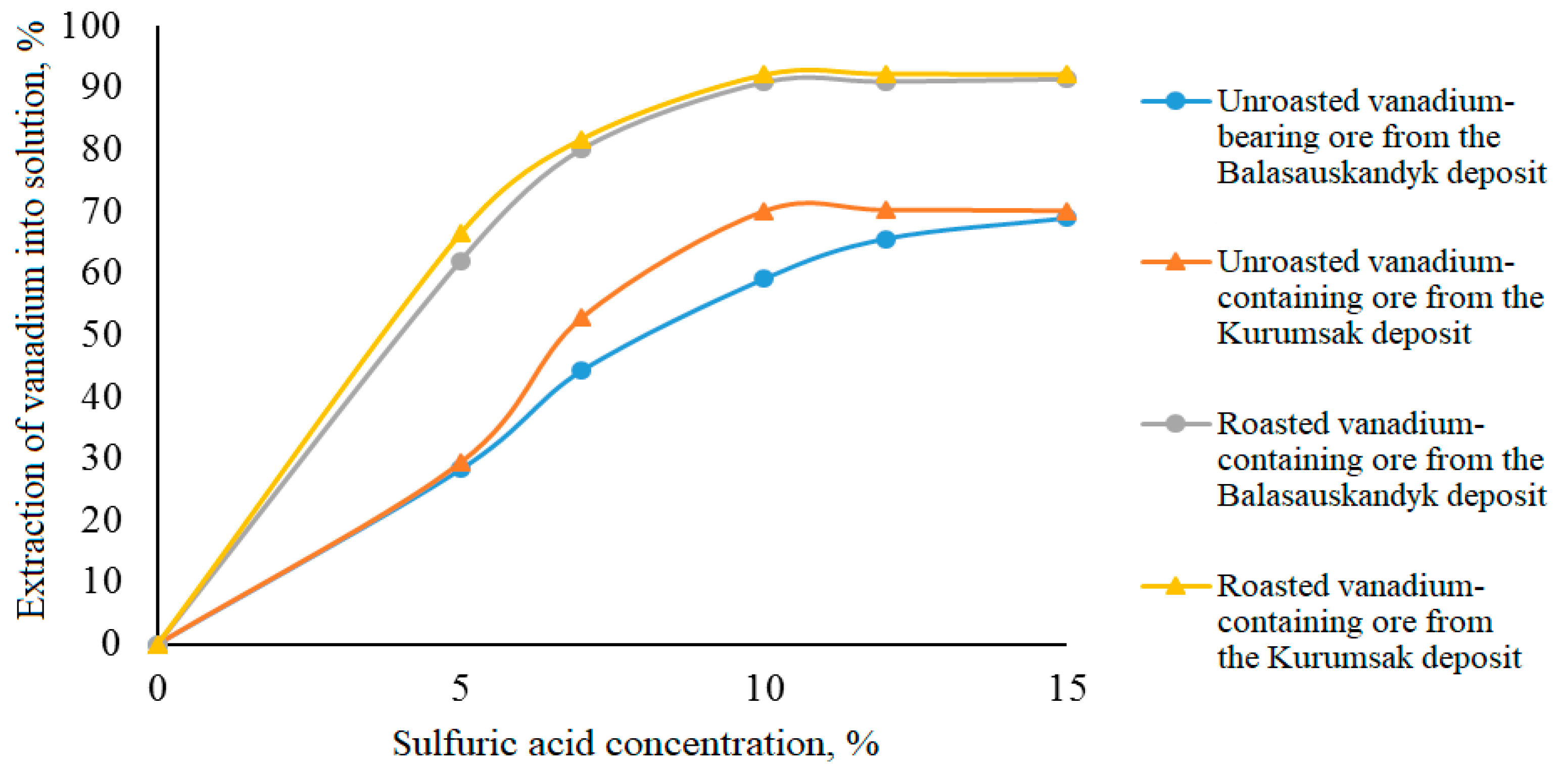 Figure 4, it follows that during electrochemical oxidation with sulfuric acid of both unroasted and roasted vanadium-containing ores, the maximum degree of vanadium extraction into the solution is achieved at an acid concentration of 10 g/dm