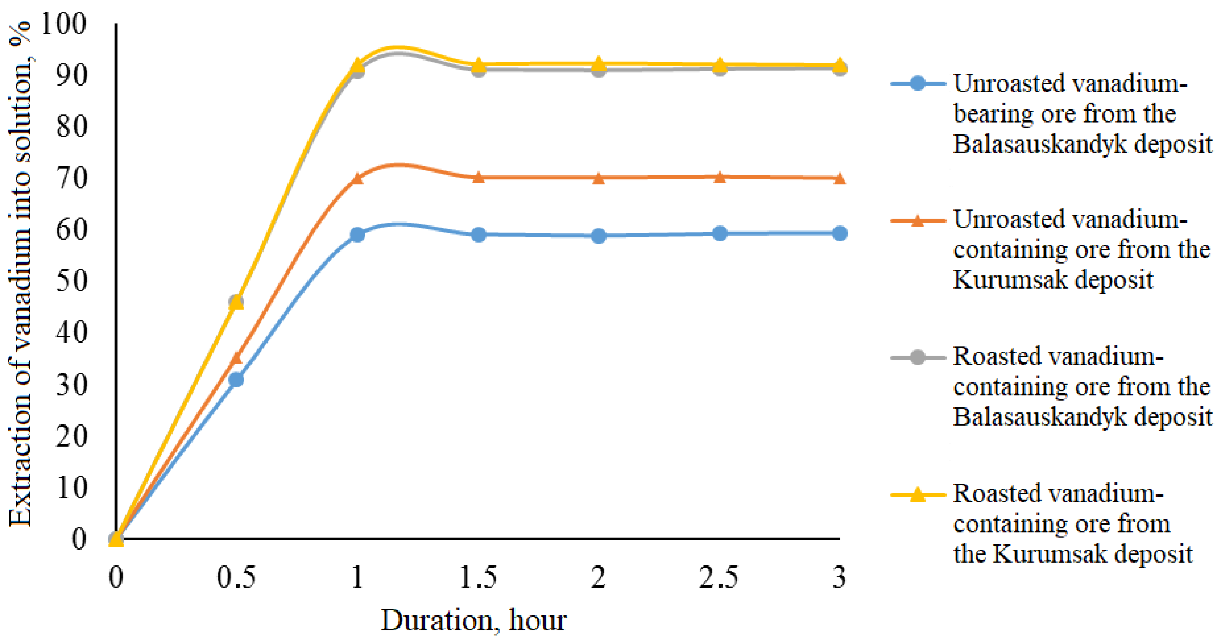 Experiments to determine vanadium extraction into solution depending on the duration of electrochemical oxidation were conducted at the following time intervals: 0.5, 1.0, 1.5, 2.0, 2.5, and 3.0 h. The obtained results are presented in