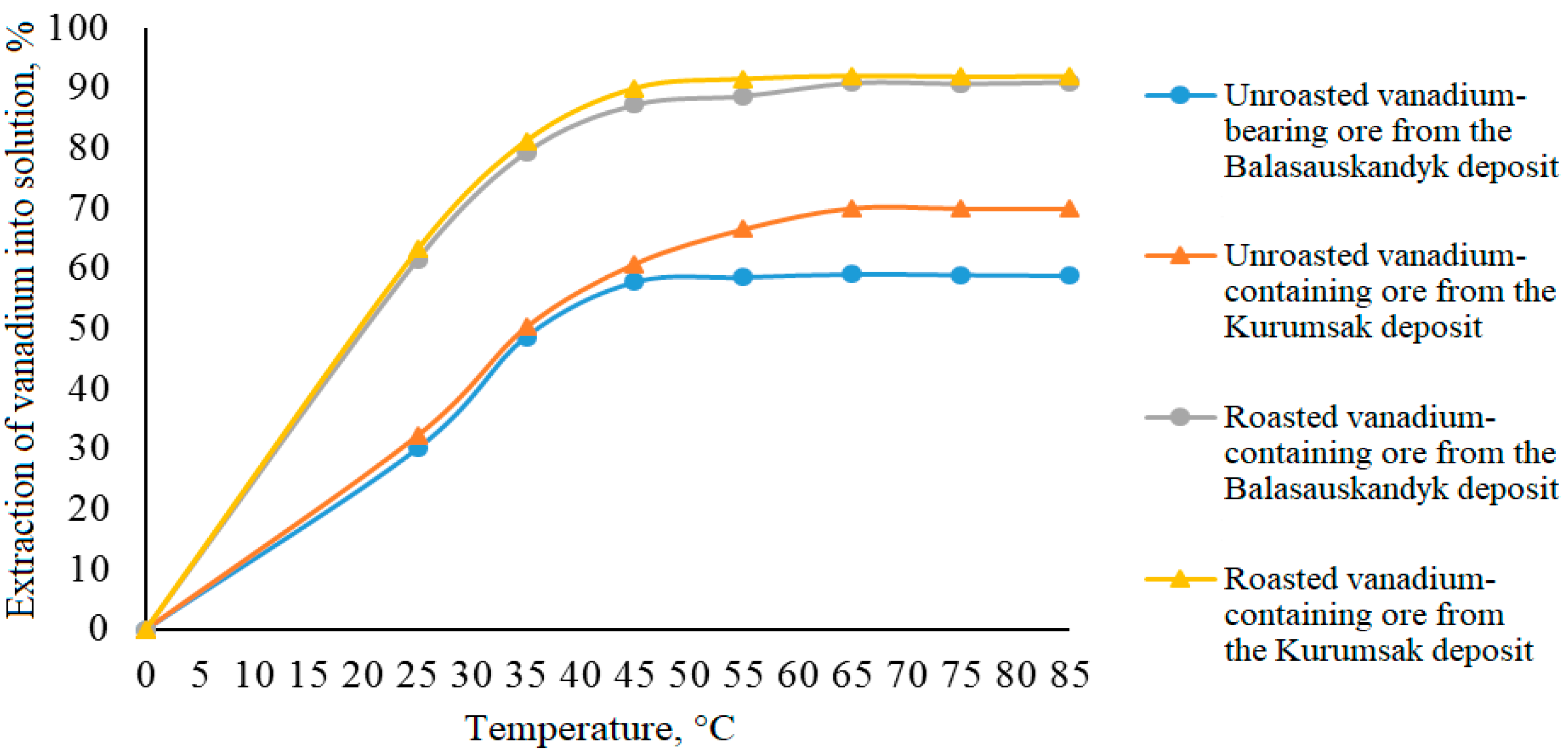Figure 7, the degree of vanadium extraction into the solution increases as the temperature rises from 25 to 65 °C. The maximum vanadium extraction reaches 70.07% from unroasted vanadium-containing ore and 92.12% from roasted ore. Increasing the temperature from 65 to 85 °C has practically no effect on vanadium extraction rates.