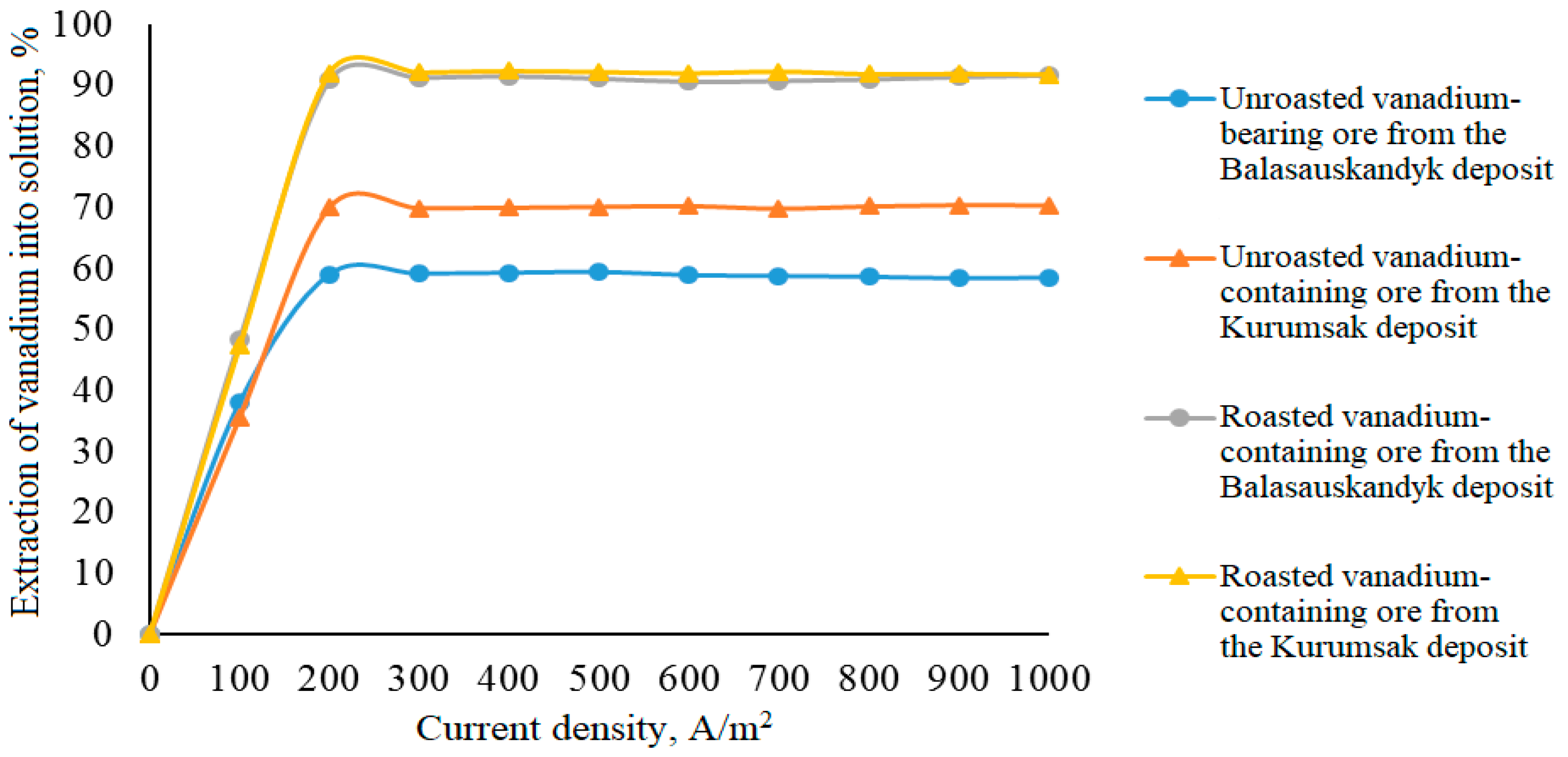 Figure 8, it can be seen that increasing the current density during the electrochemical oxidation of unroasted and roasted vanadium-containing ores positively affects the transfer of vanadium into the solution. At a current density of 100 A/m
