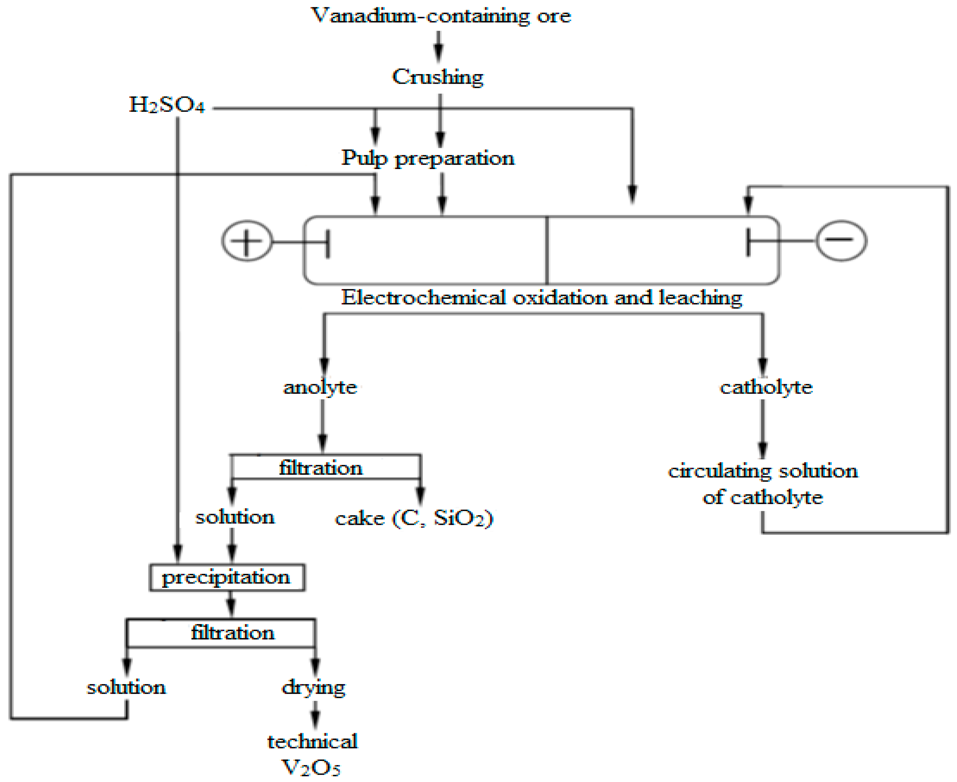 Currently, there is no available literature on the electrochemical oxidation of vanadium directly from natural mineral raw materials, which emphasizes that the presented experimental studies on the electrochemical oxidation of vanadium from ore materials have been conducted for the first time [