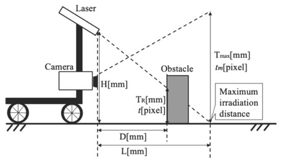 To address the limitations of conventional high-cost sensors [,,], recent studies have investigated obstacle detection methods using a monocular camera combined with a line laser, as illustrated in Figure 1 []. Unlike LiDAR and millimeter-wave radar, this approach offers significant cost advantages and is less affected by surface reflectivity or ambient lighting conditions. As shown in Equations (1) and (2), the height and distance of obstacles are calculated using trigonometric relationships by detecting the projected laser line in the camera image. Specifically, let H be the height of the laser from the ground, L the maximum projection distance of the laser,  the vertical length in the camera image corresponding to the maximum distance,  the pixel value in the image at the maximum distance, and t the pixel value where the laser hits the obstacle. Based on trigonometric principles, the height  of the obstacle and the distance D to the obstacle can be estimated as follows.