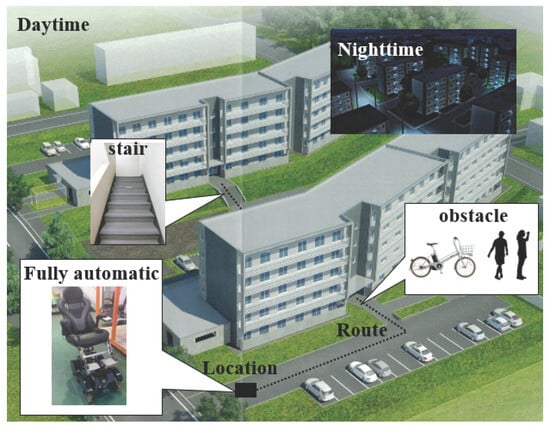 As shown in Figure 2, this study introduces a novel autonomous mobility system by integrating 3D measurement-based obstacle detection and stair structure recognition into a fully automated electric wheelchair capable of stair traversal. By integrating monocular visual sensing with laser-based spatial recognition, the system achieves robust environmental perception regardless of illumination and enhances mobility within complex three-dimensional environments. The proposed approach addresses a significant limitation of conventional mobility aids and contributes a foundational technology toward expanding the daily living range of elderly and physically impaired individuals, thereby advancing the realization of a truly barrier-free society.