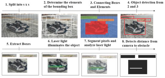 Figure 3 illustrates the image analysis process up to the point at which the laser is detected. First, the input square image is divided into smaller S × S grid cells. Each grid cell is assigned a number of bounding boxes, each of which is comprised of five parameters: the x and y coordinates of the center; the width and height of the box; and the confidence score. For instance, if three bounding boxes are assigned to one grid cell, the five parameters are used to determine whether each box corresponds to a background or an object, and the class to which each grid cell belongs is determined. Increasing the number of classes allows for the detection of more types of obstacles. In this way, approximately 100 classes are defined. The probability of each class for each grid cell is calculated, and the class with the highest probability is output. A class decision is made for each grid cell, and the object’s range is determined by color-coding. The definition of approximately 100 classes is not intended to represent 100 distinct obstacle types, but rather to enhance the granularity of detection by accounting for variations in reflection, size, and shape. This approach improves the robustness of obstacle recognition in diverse environments while maintaining a balance between detection accuracy and computational efficiency.