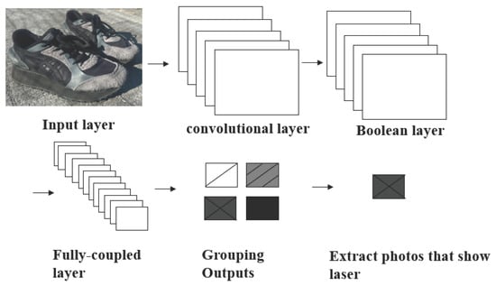 To select the most appropriate class from multiple bounding boxes, non-maximum suppression is performed. This involves selecting the bounding box with the highest confidence for each class and removing overlapping boxes (based on the Intersection over Union [IoU]) if they overlap above a certain threshold. The detected objects are then extracted, and the object illuminated by the laser is automatically selected. To precisely detect the pixel coordinates of the laser light, pixel segmentation is performed within the detected object. Finally, by converting the most laser-adjacent HSV hue to white color information and all other colors to black, it becomes possible to detect the object type and the laser light on the object with high precision. HSV means Hue, Saturation, and Value, which is a color model used to represent and process colors in image analysis. Figure 4 shows a simplified flow of CNN for object recognition and laser detection when an image is input. To detect an object such as a shoe, the laser light on the shoe is detected by convolutional layers that extract local features, such as edges and color changes. A pooling layer is added to provide translation invariance so that extracted features are not affected by movement. Based on the extracted features, the fully connected layers perform final classification and prediction to detect the object. Finally, an image containing the laser light in the detected objects is selected.