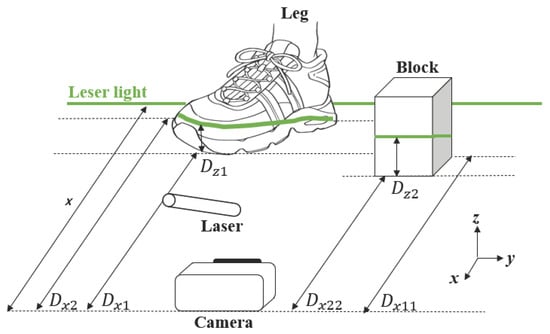 Figure 5 presents a model for detecting the height and depth of an object based on the feature points of a laser beam projected onto the camera image. Let us assume that the maximum distance of the laser beam is x. In this model,  and  represent the distances from the camera to the tip and back of the shoe, respectively, while  and  represent the distances from the camera to the tip and back of the block. The corresponding heights of the shoe and the block are  and . The distance to the object, as well as its height and depth, can be calculated from the camera image by first determining the heights in the image plane using the number of pixels corresponding to the feature points. Specifically, let H be the height of the laser beam,  the number of pixels in the camera image corresponding to the maximum exposure distance x, and  the actual distance in the camera image corresponding to this maximum distance. The pixel counts at the tip and back of the shoe are denoted as  and , respectively, while the pixel counts at the tip and back of the block are  and . The heights in the image plane () are first computed using Equation (7), and then the actual distances from the camera to the feature points () are obtained using Equation (7). In this way, the model translates the 2D pixel measurements of the laser projection into 3D physical distances and heights of the object.