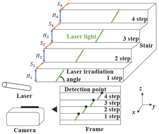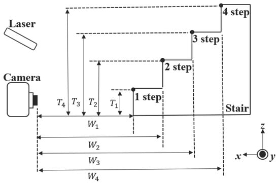 This method allows for real-time detection of the height and depth of all steps visible in the camera image. Since the method uses both the monocular camera and the laser, it can detect the number, height, and depth of steps even in low-light conditions. Figure 6 contains a model diagram of the stair structure recognition technique using the monocular camera and laser. Specifically, the actual height of each step , , , and , and depth of each step , , , and  can be detected. This is accomplished by adjusting the laser’s emission angle towards the stairs in front of the camera.