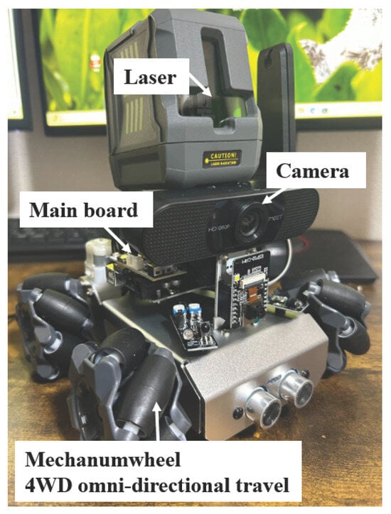 To verify the effectiveness of the self-controlled autonomous movement mechanism integrated with 3D spatial recognition using a monocular camera and laser, obstacle recognition and shape measurement with CNN, and stair structure recognition technology, a path-planning method was combined. Principle analysis and algorithm construction were performed using a small autonomous movement platform, and feasibility was determined by applying it to a fully omnidirectional self-controlled autonomous electric wheelchair. Figure 9 shows the small autonomous movement platform. By combining the main board with an Arduino UNO and controlling four motors, two front and two rear Mecanum wheels were operated. The use of Mecanum wheels enabled omnidirectional movement—including forward, backward, lateral, diagonal, and rotational motions—allowing the robot to accurately avoid complex obstacles [,]. Table 1 presents the specifications of the small omnidirectional robot used in this study, which is equipped with Mecanum wheels and capable of moving in any direction.