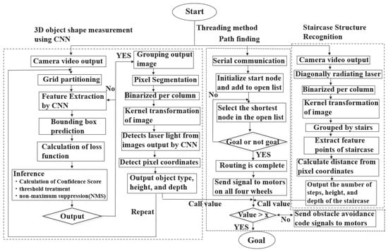 As shown in Figure 10, the proposed method implements three algorithms simultaneously in parallel on a single platform: (1) obstacle recognition and shape measurement using a monocular camera and laser with CNN; (2) A-star path planning; and (3) stair structure recognition with monocular cameras and lasers, enabling real-time processing. For (1), the camera is activated, and the input image is resized to a fixed size suitable for the model. The input image is then divided into an S × S grid, with each grid cell responsible for a specific region within the image. CNN is used to extract image features, and by using Darknet-53 (Darknet-53 is a 53-layer convolutional neural network used as the backbone of YOLOv3 (original version), providing a good balance between accuracy and speed, making it effective for real-time object detection), a high-precision and fast network can be realized. Each grid cell predicts information such as the center coordinates, width, height, confidence score, class probability distribution, and output tensor shape of bounding boxes. During the learning process, the coordinate loss, confidence loss, and class loss are computed to minimize the loss function. Subsequently, inference processes such as confidence score calculation, threshold processing, and non-maximum suppression (NMS) are performed. The final bounding boxes and class labels are output, and the images are grouped. After grouping, pixel segmentation and binarization processing are applied. Kernel transformation is applied repeatedly for image dilation and compression, reducing noise from non-laser regions. Only the portions where laser light is present in the grouped images are extracted. Finally, by outputting the pixel coordinates in the frame and substituting them into the distance calculation formula of the proposed method, the type, depth, height, and distance to the obstacle can be detected simultaneously in real time.