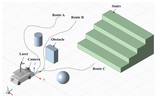 In particular, research on obstacle avoidance and path planning in complex environments, including staircases, has attracted increasing attention. The ability of robots to autonomously explore unknown environments and safely avoid physical obstacles and steps is a crucial factor in their development [,]. At the same time, the demand for autonomous mobile robots is rapidly expanding. According to a U.S.-based market research firm, the global market for autonomous mobile robots is projected to grow at a compound annual growth rate (CAGR) of 15.5% from 2020 to 2025, reaching a market value exceeding one billion dollars by the end of 2025. Autonomous driving and robotics technologies are expected to play a vital role in addressing labor shortages, particularly in aging societies where the need for caregiving and mobility assistance robots continues to rise [].