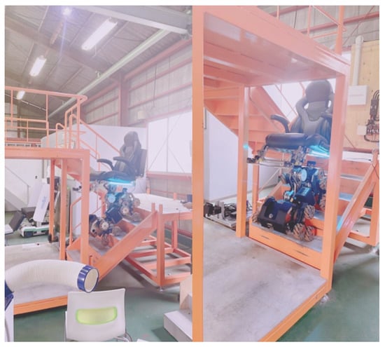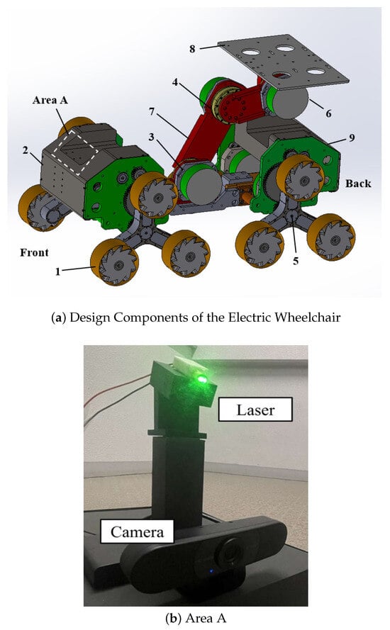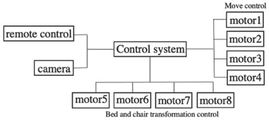 Figure 12 and Figure 13 illustrate the feasibility of the omnidirectional self-controlled autonomous electric wheelchair and its organizational diagram, respectively. The components shown in Figure 13 are listed in Table 2. To achieve omnidirectional movement and stair climbing, three mecanum wheels were mounted on the drive shaft of each motor. Thus, the electric wheelchair is equipped with a total of 12 wheels, driven by four motors. To maintain horizontal alignment of the chair with the ground during stair climbing, four additional motors are installed in the chair. Figure 14 illustrates the control system and signal pathways to the motors, as well as the relationship between the camera and remote controller. The system was constructed similarly to the small autonomous movement mechanism shown in Figure 9.