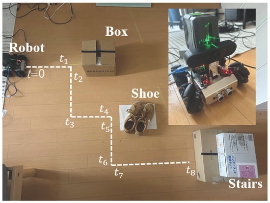 To verify the effectiveness of the proposed method, we conducted experiments using a small-scale autonomous mobile robot integrated with a path planning algorithm. These experiments evaluated the capability of real-time obstacle shape measurement and stair structure recognition. Furthermore, in consideration of practical feasibility, the proposed method and path planning were implemented in a fully autonomous electric wheelchair capable of stair navigation. Accordingly, the validation of the proposed method consists of two stages, presented in the following sections. Although previous studies have proposed distance measurement methods using a monocular camera and laser, they typically report a maximum error of 2.35 cm []. However, such methods are not capable of real-time processing and only measure the distance to obstacles without performing three-dimensional shape reconstruction or stair structure recognition. In contrast, the proposed method enables both real-time processing and 3D spatial measurement, including the recognition of stair geometry. Thus, while the previously reported accuracy serves as a reference, the proposed method provides a more comprehensive and practical solution for autonomous navigation in complex environments.