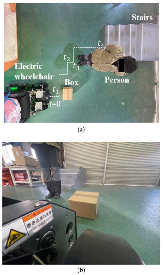 Environment for the omnidirectional self-controlled autonomous electric wheelchair experiment (outdoors). (a) Experimental environment viewed from above; (b) image captured from the perspective of the electric wheelchair.