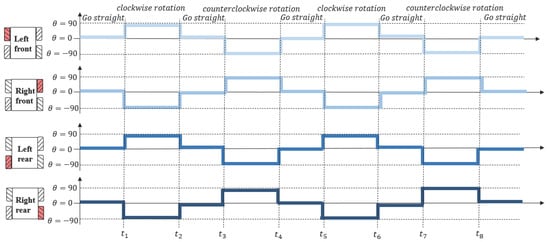 In Figure 17, the horizontal axis represents the elapsed time of the experiment, and the vertical axis shows the wheel rotation angles. For example, when all four wheels are set to 0 degrees, the robot moves straight ahead. When the rotation angles of all wheels are set to 90 degrees, the robot moves directly to the right. Conversely, when the left wheel is set to 90 degrees and the right wheel to -90 degrees, the robot rotates in place to the right. Adjusting the rotation angles of the wheels enables movement of the robot in the desired direction. This control scheme leverages the advantages of the mecanum wheels, enabling omnidirectional movement and allowing the robot to freely navigate in various directions. The control signals are transmitted to the robot through the Arduino IDE platform, enabling real-time control.