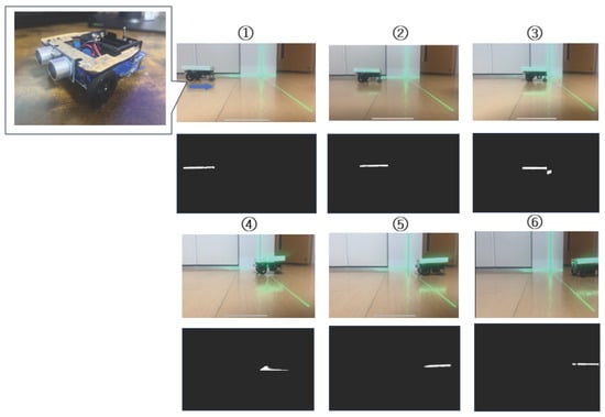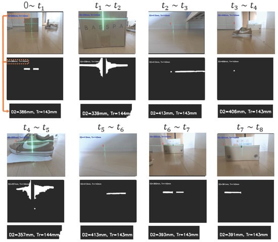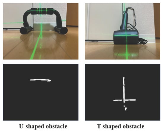 Figure 21 shows the results of detecting complex-shaped obstacles using the proposed method. Specifically, U-shaped and T-shaped obstacles were employed. As shown in the figure, the proposed method accurately extracts laser light reflected from the obstacles. Distance measurements were performed three times, resulting in an average error of 0.42 cm. Furthermore, Figure 22 presents the results of detecting dynamic obstacles using the proposed method. A two-wheeled small mobile robot was used as the dynamic obstacle. The robot was driven by a stepping motor switched on and off to move at a constant speed. The figure demonstrates that the laser light reflected from the dynamic obstacle can be extracted in real time with high accuracy. The robot was moved laterally while keeping its distance from the camera constant. Distance measurements were conducted three times, resulting in an average measurement error of 0.11 cm. This small error is attributed to the constant distance maintained during the experiment. Currently, the IBA and IFGM algorithms have been shown in simulations to achieve high-performance navigation for U- and H-shaped obstacle avoidance in a safe and autonomous manner. By combining the sensors used in the proposed method, it is expected that high-precision obstacle avoidance can also be realized experimentally [].