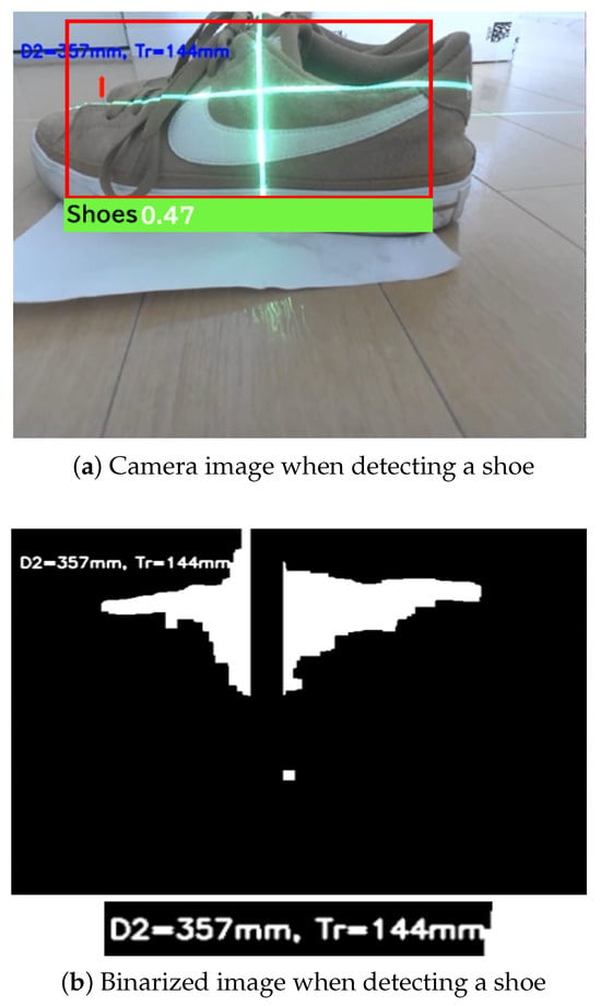 Figure 18 shows the results of real-time obstacle detection using CNN. The system accurately detected various parameters of obstacles, including the type, shape, distance, height, depth, and number of steps. Notably, in the binarized images, vertical lines from the laser were disregarded, and appropriate masking was applied. Therefore, all the results are derived from real-time processing. The binarization processing accurately extracted the laser light reflected off the obstacles, enabling precise output based on the detected numerical data from the camera images. When the distance from the robot to the obstacle exceeded 360 mm, it followed the path planning algorithm; when the distance was 360 mm or less, it stopped and executed avoidance behavior, demonstrating the effectiveness of the proposed method in executing avoidance behavior based on real-time distance measurements. The maximum error between the actual distance and the distance measured using the proposed method was 0.8 cm. In comparison, the maximum error in previous studies was 2.35 cm, confirming that the proposed method is 1.55 cm more accurate. The maximum error of 0.8 cm corresponds to the average of three experimental runs. The standard deviation of the error across these runs was approximately 0.12 cm, indicating that the proposed method provides consistent and reliable distance measurements in repeated trials. The height  of the obstacle is an important parameter for detecting the distance , which is essential for precise distance measurement. Figure 19 shows the successful implementation of object detection using the CNN and laser. Ultimately, based on the class extracted from the bounding box, the obstacle was identified as a shoe. The precise binarization of the laser-illuminated area allows for accurate detection of the obstacle’s position, and especially in outdoor environments, the high probability of detecting the position of shoes when detecting humans further confirms the high feasibility of the proposed method.
