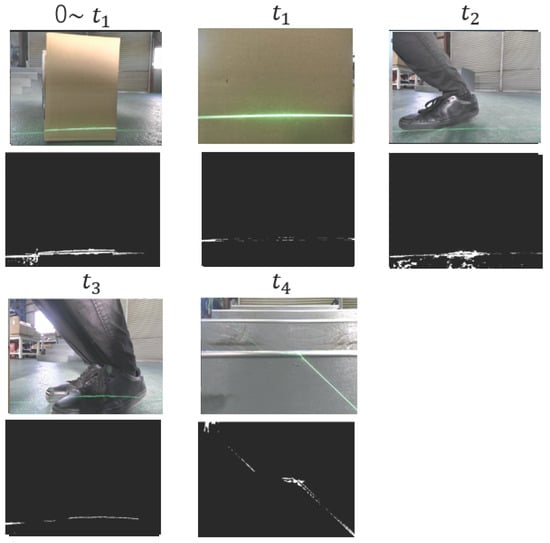 The behavior of the omnidirectional self-controlled autonomous electric wheelchair implementing the proposed method is shown in Figure 23, using camera and binarized images captured at specific points from Figure 16. The stair ascent and descent observed after stair detection is presented in Figure 24. In Figure 23, between 0 and , the electric wheelchair approaches an obstacle. Upon detecting the distance to the obstacle below the predetermined threshold at , it automatically stops. At , it approaches a human. At , when the distance to the human reaches a predefined value, it stops again. Finally, the wheelchair recognizes the structure of the stairs, confirming its ability to appropriately ascend and descend them. When the distance from the wheelchair to an obstacle becomes less than 360 mm, it automatically halts, and control signals are transmitted to the motors to execute an avoidance maneuver. If no obstacles are within 360 mm, control signals are sent based on the pathfinding algorithm, allowing continuous movement. The laser light is accurately extracted at all measurement points, and the system can distinguish between different types of obstacles, such as boxes and humans. Additionally, precise distance measurements from the wheelchair to objects are obtained from the binarized images, confirming that the wheelchair can successfully avoid obstacles while moving.