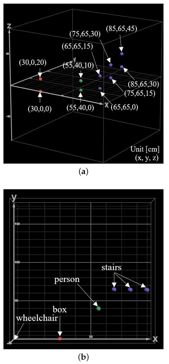Results in 3D coordinates of objects detected by the laser: (a) 3D coordinate results when detecting obstacles and stairs; (b) detection points on the x-axis and y-axis.