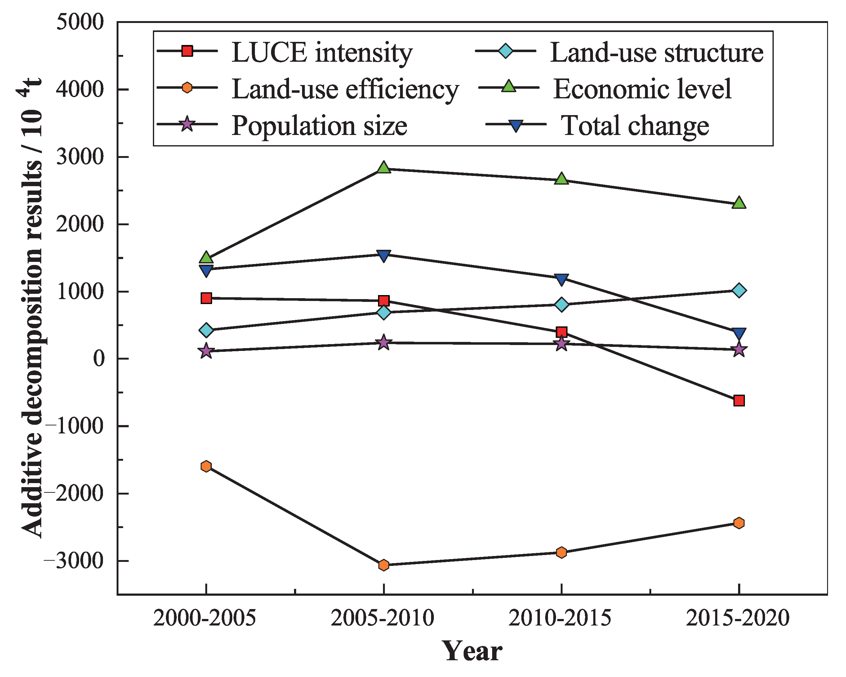 There are no unexplained residuals in the decomposition results from the LMDI model, allowing relatively simple transformation expressions for additive and multiplicative decomposition to be obtained. Therefore, the driving factors behind LUCEs are commonly modeled this way. Referring to the Kaya identity [