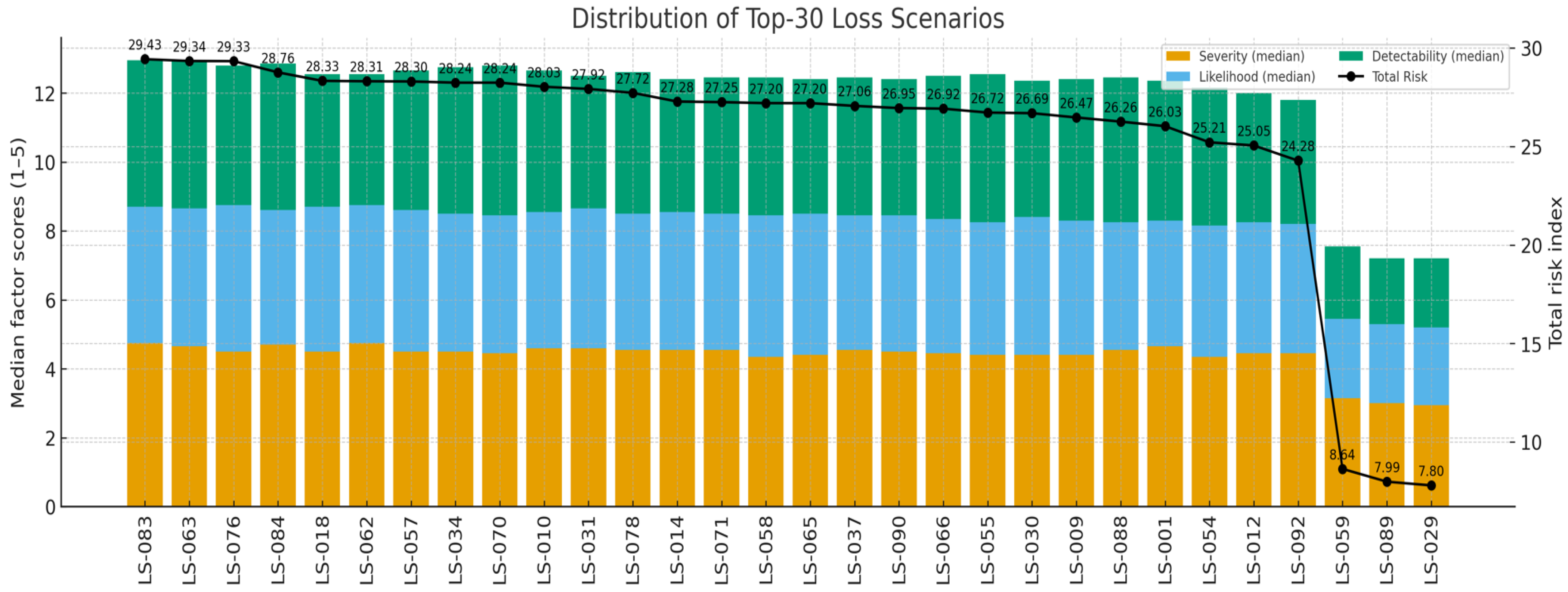 The prioritization process produced both stability and clarity. High-severity and high-likelihood scenarios, such as propulsion control failures (LS-009, LS-066) and critical communication breakdowns (LS-030, LS-062), consistently occupied the top ranks. These scenarios reflect hazards with immediate catastrophic potential, where operator intervention may be ineffective without redundant safeguards. Equally important, the results highlighted scenarios with high severity but low detectability, such as cognitive overload of ROs and delayed alarm recognition (LS-037, LS-083). Although these risks were sometimes rated lower in likelihood, experts converged on their salience due to the challenges of monitoring human performance in real time. Conversely, scenarios with low severity and high dispersion (e.g., LS-059, LS-089) dropped to the bottom, confirming stable expert rejection. Taken together, these patterns underscore the multidimensional nature of risk: MASS safety cannot be understood solely in terms of technical redundancy, but must also address human–machine integration and cognitive resilience.