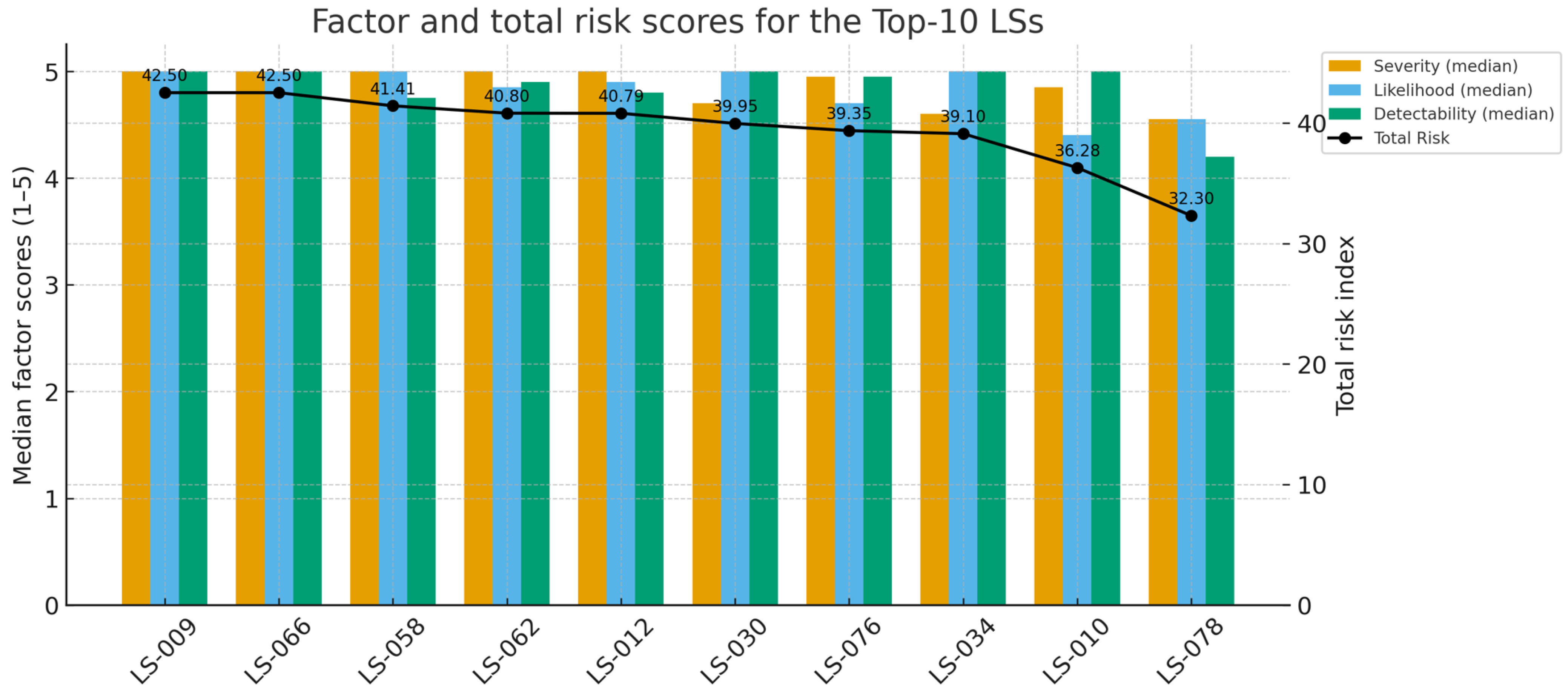 The Delphi process was then applied to elicit and refine expert judgment in areas where empirical accident statistics are scarce. Across two rounds, the 20-member panel—drawn from academia, industry, seafaring professionals, and regulatory bodies—rated each LS in terms of severity, likelihood, and detectability. Round 1 demonstrated the expected divergence of opinion, with a Kendall’s W of 0.07, reflecting heterogeneity of perspectives. However, Round 2’s structured feedback and convergence mechanisms elevated concordance to W = 0.693, well above conventional thresholds for Delphi consensus. This result highlights the utility of iterative expert elicitation in domains of high uncertainty and demonstrates that even diverse panels can achieve robust alignment when guided by transparent procedures.
