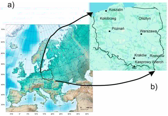 The location of the stations (seven cities and one mountain—Kasprowy Wierch) together with their latitudes and longitudes are included in Table 1. The locations of the Polish meteorological stations against the background of the network of European meteorological stations as a whole are presented in Figure 1b.