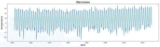 The data from the eight Polish stations covering a total of 888 air temperature values (74 years × 12 months) for each of the meteorological stations. One example of a time series showing changes in monthly air temperature values in the period 1951–2024 (Warsaw) is presented in Figure 2.