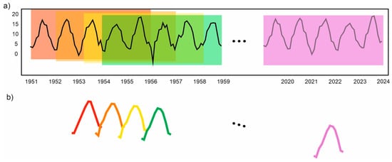 To identify characteristic patterns of thermal variability, the analyzed dataset of mean monthly air temperatures covering the period 1950–2024 was divided into annual cycles, each representing a complete year of observations. This decomposition yielded a total of 74 annual curves. To visualize the long-term evolution of annual temperature changes, the data were displayed as a sequence of annual cycles. In order to minimize the influence of local fluctuations and enhance the clarity of inter-annual variability, the cycles were further smoothed using five-year moving averages. The methodology applied in these calculations, together with the corresponding mean values for the periods 1951–1955, 1952–1956, 1953–1957, 1954–1958, and 2020–2024, is presented in Figure 3.
