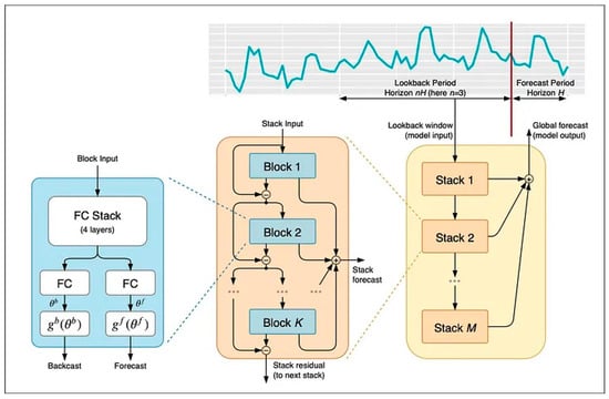 A single stack comprises multiple basic blocks arranged in accordance with the doubly residual stacking principle. Within this framework, the input to each block is obtained by subtracting the output of the previous block from its respective input. The final forecast output of a stack is obtained by adding up the forecast outputs of all the constituent blocks. Forecasts are aggregated in a hierarchical manner, thereby facilitating the construction of a deep neural network capable of capturing complex temporal dependencies. In the present study, interpretable configuration of the N-BEATS architecture was employed. Unlike the generic variant, which consists of at least 30 stacks, the interpretable model is designed with two stacks. This configuration sequentially breaks down the input signal into polynomial and harmonic bases with the aim of capturing trend and seasonality components. Each stack comprises three blocks, whereas in the generic version, each stack contains only a single block. Furthermore, the basis layer weights are shared at the stack level, thus enhancing the model’s interpretability and structural coherence.