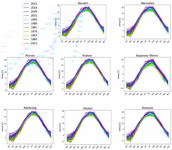 The temperature values shown in Figure 6 align with the average temperature values calculated for the entire European dataset []. The patterns in mean temperature values for particular months indicate variability. After an initial period of fluctuations around the mean temperature value each month a consistent upward trend is noticeable in mean monthly temperature values. This change is especially evident in mean temperatures in the spring and summer months (March–July). Mean temperature curves calculated for the autumn and winter months (August–February) also indicate an increase in the mean temperature; however, such a rise does not point to such a strong linear trend as was noted in the summer months. Moreover, in recent years, a distinct downward tendency in mean temperatures has been noted for the period from August to November, suggesting a localized cooling effect during the early autumn season.