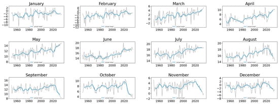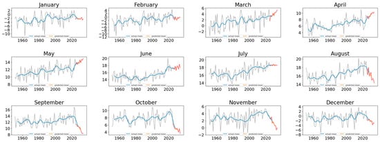 Variability of mean monthly temperatures in Poland from 1951 to 2024 (grey line), including predicted future trends over the next 10 years (red line). The diagrams also include values averaged using a size 7 Gaussian window and a standard deviation of 2 (blue line).