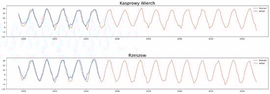 The predicted results for two meteorological stations—Rzeszów and Kasprowy Wierch—together with the actual values from the validation sets (rescaled to their original real-world units) are presented in Figure 8. These two stations were selected as they represent the best and worst forecast performance, respectively, within the group of analyzed locations in terms of MAPE, RMSE, and R2. The monthly average temperatures were forecast for a future time span of ten years, covering the period from January 2025 to December 2034.