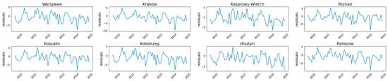 Residual diagnostics confirmed that the residuals obtained from N-BEATS forecasts were, in most cases, normally distributed, uncorrelated, and homoscedastic. The Shapiro–Wilk test indicated no significant deviations from normality for any of the eight stations, confirming that the model captured the main patterns of thermal variability without systematic bias. The Ljung–Box test results suggested that residuals were free from serial correlation at most stations, with the exception of Warszawa and Kasprowy Wierch, where weak autocorrelation was detected (p < 0.05). However, this effect was marginal and did not materially affect overall forecast performance. Furthermore, the ARCH test showed no evidence of heteroscedasticity across all analyzed stations (p > 0.05), implying a stable variance of forecast errors over time.