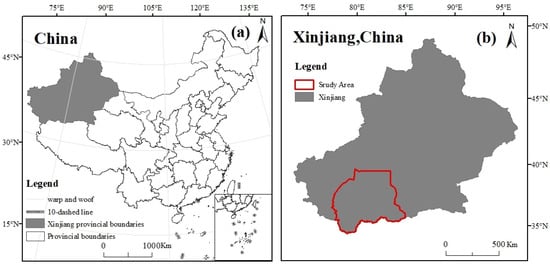 (a) The province in China where the study area is located at; (b) the location of the study area in Xinjiang, China.