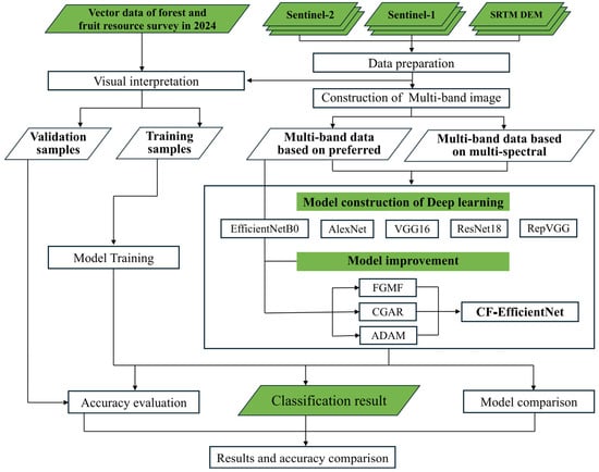 The overall workflow is illustrated (Figure 2). Multi-source remote sensing data were used, and a feature selection strategy identified key spectral bands with high discriminative power to construct an optimized band dataset. To evaluate the effectiveness of feature selection, two classification datasets were developed: one using original multi-spectral bands and the other using selected optimal bands. These were used in comparative experiments involving multiple deep learning models to assess their performance in fruit planting classification. Based on the results, an enhanced CF-EfficientNet model was proposed, with EfficientNetB0 as the base architecture, to improve classification accuracy and robustness.
