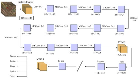 The overall architecture of the proposed CF-EfficientNet is depicted in Figure 3. To address the limitations of traditional convolutional networks in capturing detailed information in high-resolution imagery, a Fine-Grained Multi-scale Fusion (FGMF) module is introduced []. This module extracts multi-scale features in parallel and applies a weighted fusion mechanism to integrate shallow spatial details with deep semantic information, thereby strengthening the model’s sensitivity to edges, textures, and other discriminative cues. Here, the name “CF” is derived from the first letters of the two key modules, CGAR and FGMF, highlighting that the model’s design leverages these modules to capture Condition-guided and Fine-grained discriminative features for fruit planting classification. This explanation clarifies the rationale behind the model naming and emphasizes its specialized function in capturing crop-relevant information.