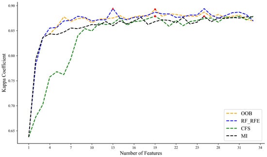 To construct an efficient, low-dimensional, and information-rich feature set for subsequent deep learning model training, the feature subsets generated by four feature selection methods—OOB, CFS, MI, RF_RFE—were compared in this study, with Cohen’s Kappa coefficient used as the primary evaluation metric. The variation in classification accuracy across different feature subset sizes is shown in Figure 4.