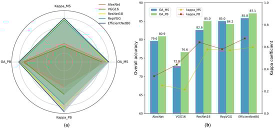 The radar chart visualizes the classification performance of the models across four metrics: OA_MS, OA_PB, Kappa_MS, and Kappa_PB. In this visualization, a larger enclosed area indicates superior performance across the evaluated metrics (Figure 5a). As shown, EfficientNetB0 encloses the largest area, highlighting its consistently outstanding performance across all indicators, whereas VGG16 and AlexNet display significantly smaller profiles, reflecting their relatively weaker classification capabilities.
