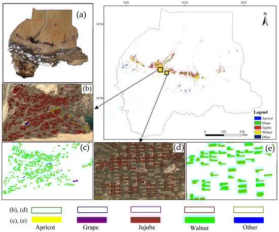 Fruit planting distribution map in the Hotan Region: (a) Sentinel-2 image; (b,d) regionally annotated image; (c,e) corresponding regional classification result.