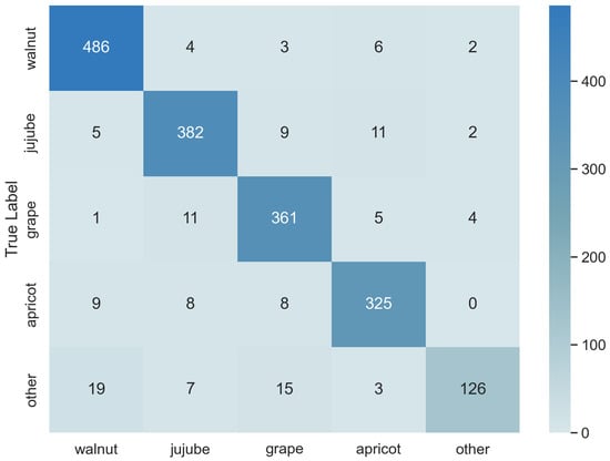 To further evaluate the classification performance of the proposed CF-EfficientNet model across different fruit tree categories, a confusion matrix was constructed based on the output of the final model (No.e), as shown in Figure 7. The confusion matrix clearly illustrates the model’s specific classification accuracy for each fruit tree category, complementing the overall accuracy (OA) and Kappa coefficient metrics at the macro level. Overall, the model’s predictions are primarily concentrated along the diagonal, indicating high classification accuracy across categories and strong agreement with the ground truth labels.